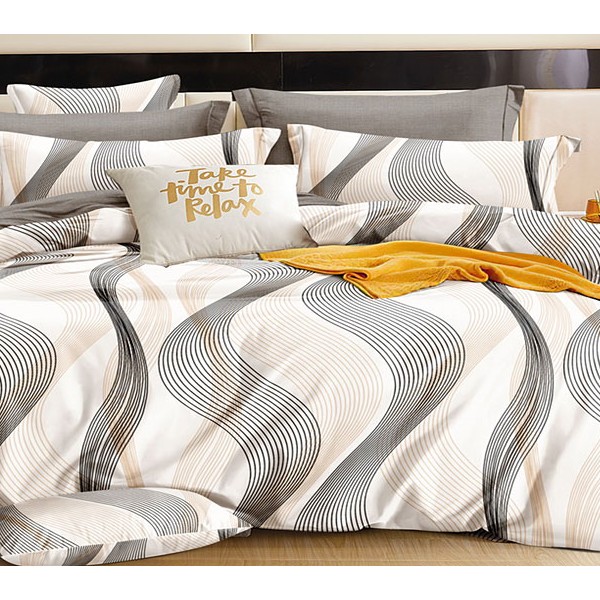 Комплекты постельного белья из черного поплина с желто-серой абстракцией и серо-черным компаньоном.