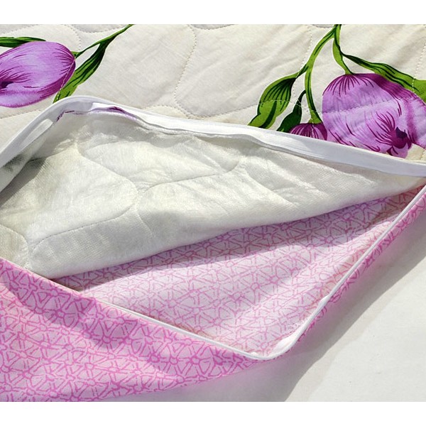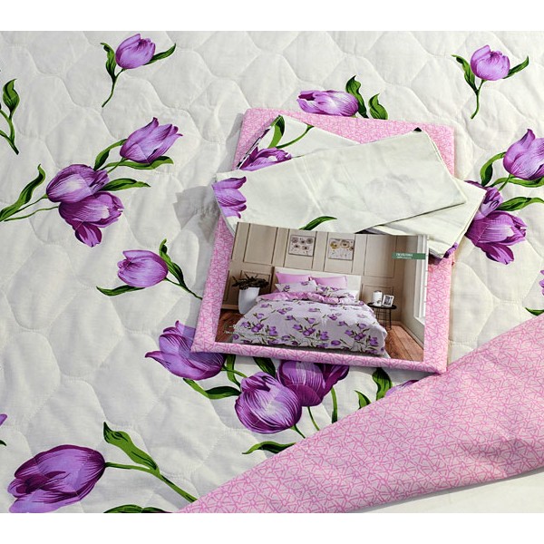 Комплект "Зима-Лето" из белого поплина с фиолетвыми цветами и светло-красным компаньоном пододеяльник простёган синтепоновой прослойкой